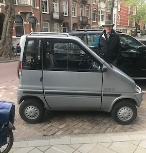 And Amsterdam has its cute little cars too. The middle one below, parked on the sidewalk, where really it doesn't take up enough room to bother anybody, is only half as long as the car it is next to.