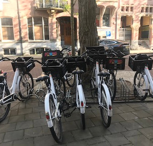 While Steve and I were in Amsterdam (we traveled home all day today and will collapse into bed fairly soon), getting around was entirely on foot, in a relatively small part of the city; for trips to and from the airport, taxis come into play. But the residents' prominent use of bicycles is a pleasure for an environmentalist to see. (They also have a good public transportation system in the form of trams and buses.) There are bike lanes on all major streets, and bike racks and parking areas for bikes are ubiquitous. We knew this already, but it's quite a contrast to any American city we're familiar with, and impressive to see.