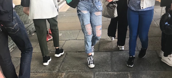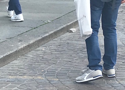 In Jackson Hole, fashion is not something that many people pay a lot of attention to--functionality and comfort are the highest values for clothing, with stylishness down the list-- and it isn't sneaker weather yet anyway. I sort of knew that white sport shoes and other color shoes with white soles were a thing--the black Altras I bought for walking city streets on this trip came in, among other color combinations, black with a white sole. But I hadn't realized how universal they are now, even more than blue jeans. I took these pictures over a period of three minutes. The twenty-first-century version of spats, I think -- clean white on your feet means you don't do dirty work.